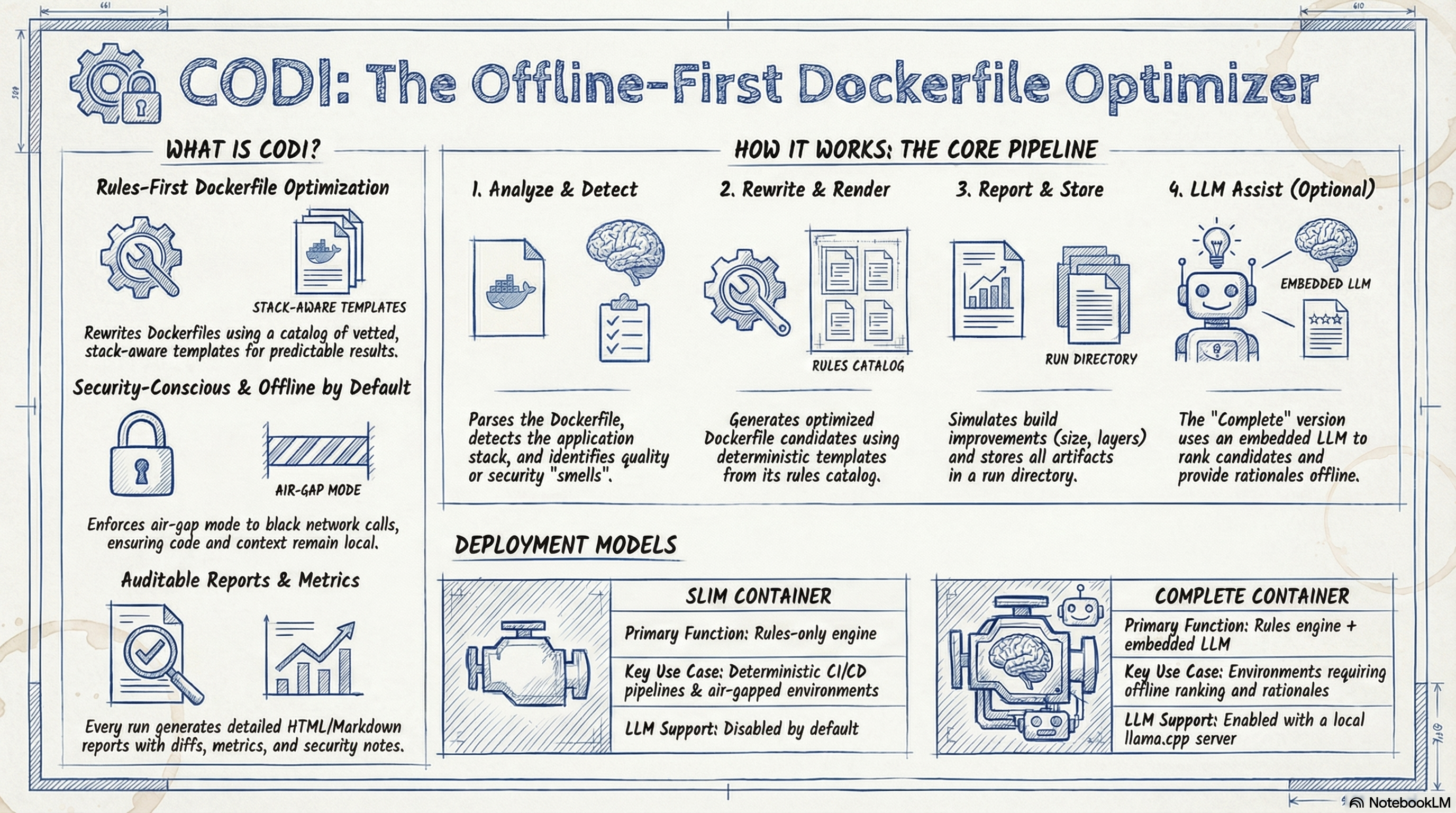 CODI pairs stack-aware templates with an embedded llama.cpp module so you can analyse, rewrite, and justify Dockerfile improvements without touching the public internet. Every recommendation ships with metrics, diffs, and policy notes ready for a hackathon board review.
